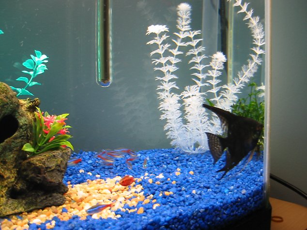 school of 13 neons, a cherry barb, and the black angelfish