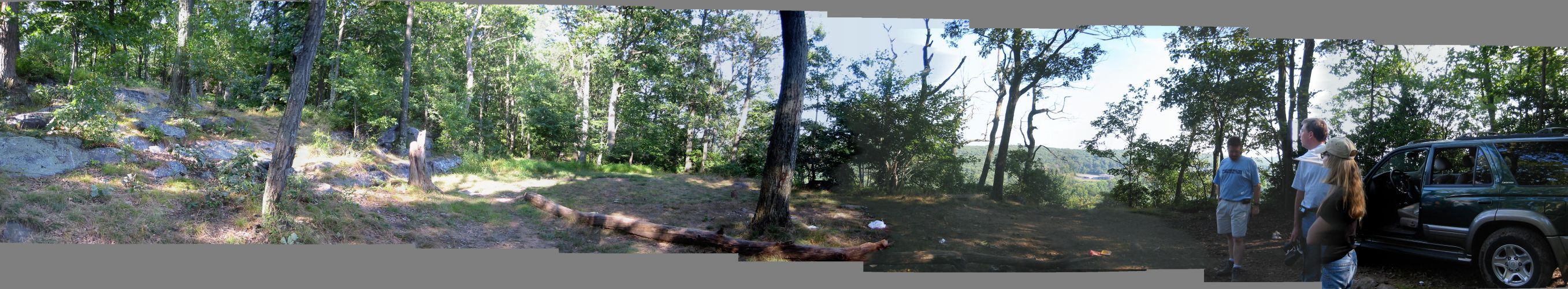 Panoramic view of the launch (scroll right to see it all). Bushes and a few trees would need to be cleared. Area is about 75' x 100' wide with a slight downward slope. The ideal launch window would be between the tree and where the people are standing.