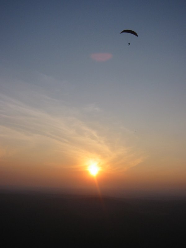 Ron about 2000 over launch. Hang glider barely visible 2 o'clock from the sun.