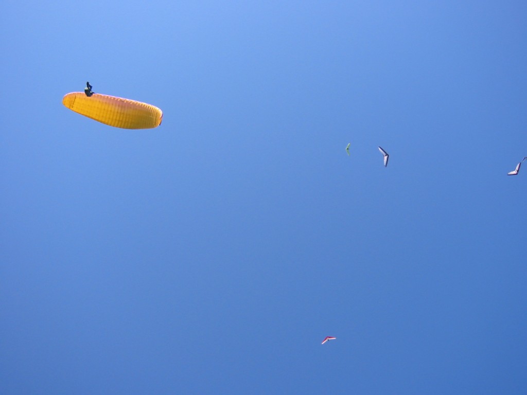 A gaggle of hang gliders and a paraglider (shot from below)